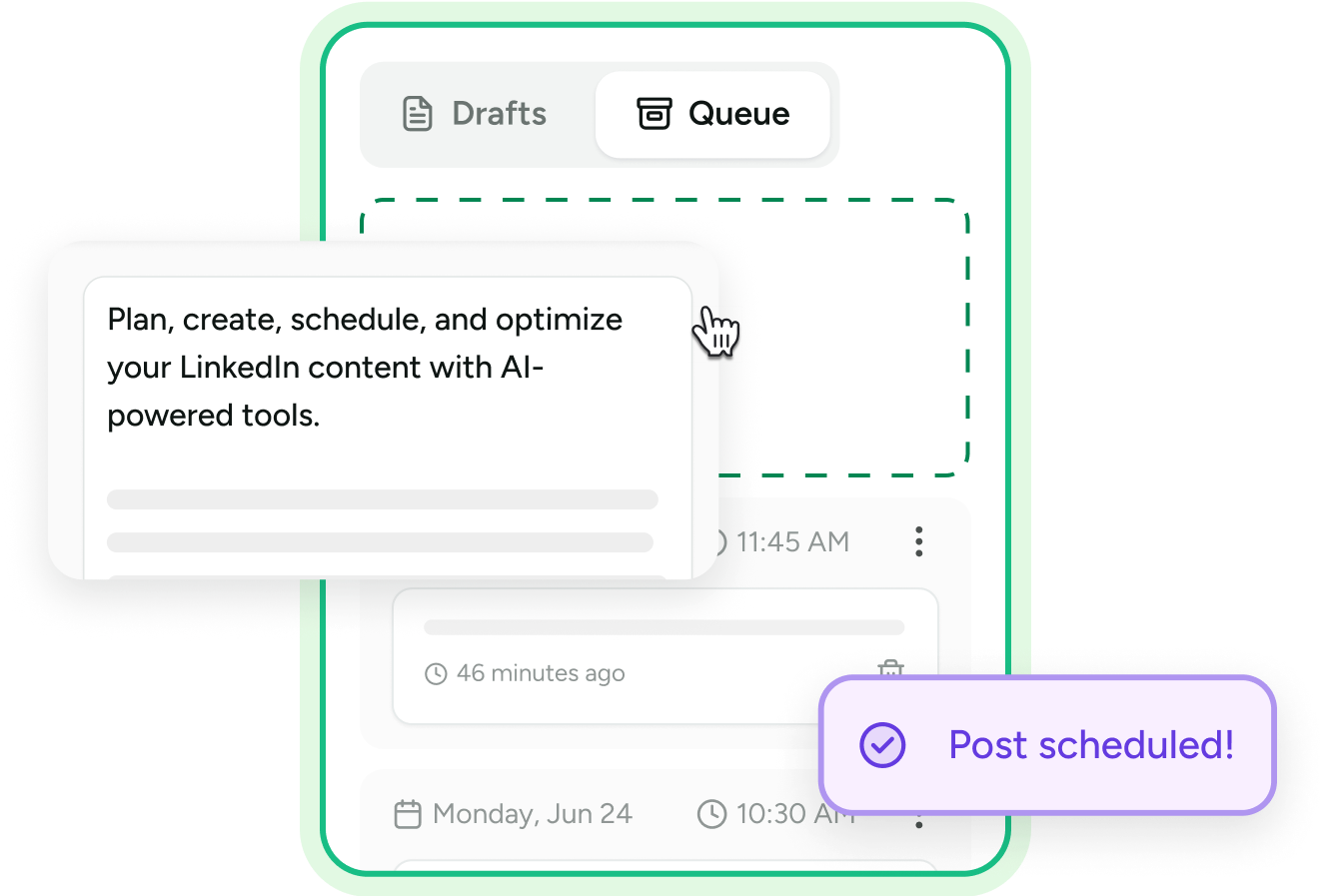 Plan, create, schedule, and optimize your LinkedIn content with AI-powered tools. Save 10+ hours per week and never miss out on posting again.